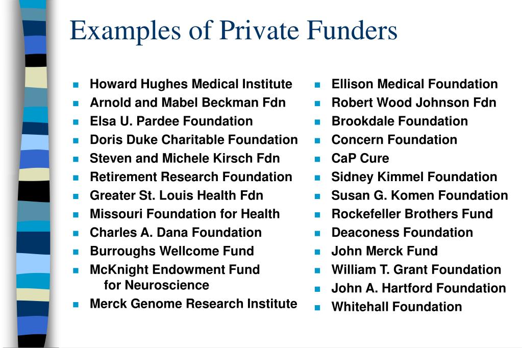 What is a Private Foundation? • Usually set up by wealthy business people • Decision makers often are not scientists • Different types of foundations • Independent • Family • Community • Public Charities • American Cancer Society, Amer. Heart Assn.