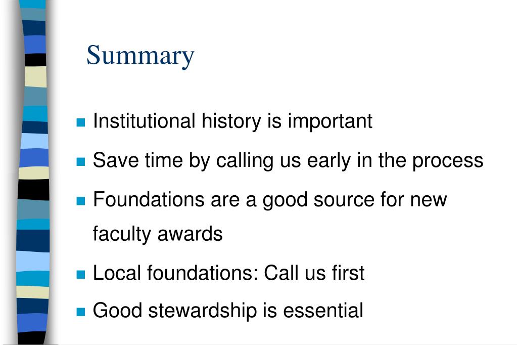 Summary • Institutional history is important • Save time by calling us early in the process • Foundations are a good source for new faculty awards • Local foundations: Call us first • Good stewardship is essential