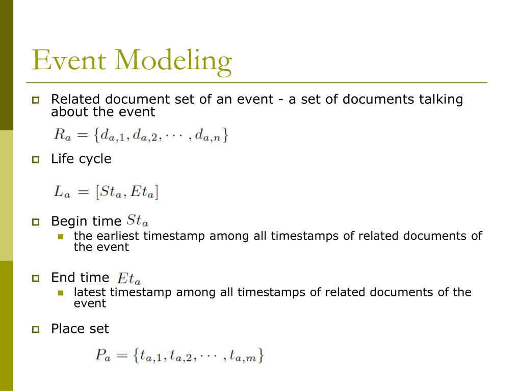 Event Modeling • Event – reported by documents • Document - A story talking about an event including the happen time, places and content of the event • Timestamp • Places • Content