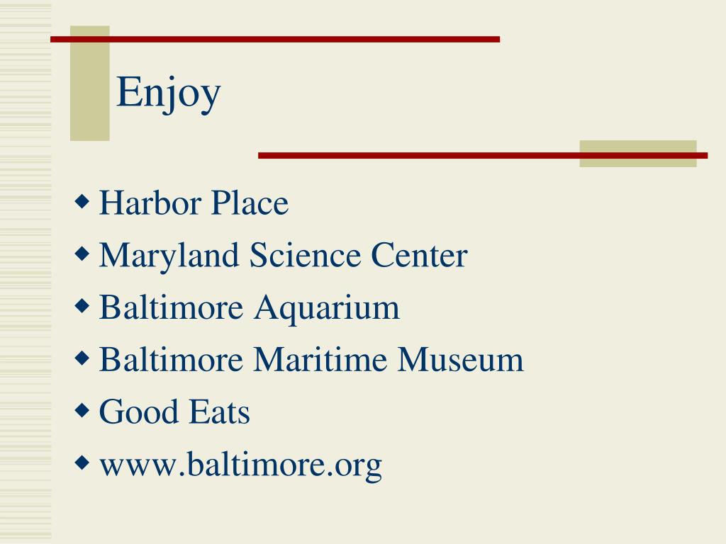 Enjoy • Harbor Place • Maryland Science Center • Baltimore Aquarium • Baltimore Maritime Museum • Good Eats • www.baltimore.org