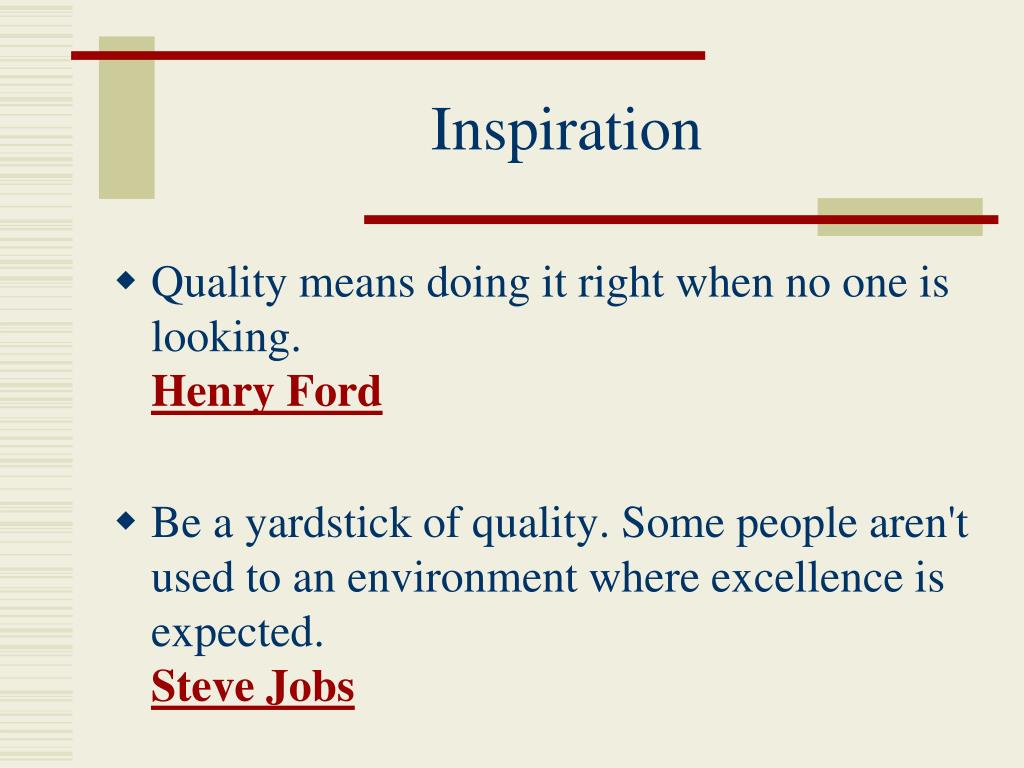 Inspiration • Quality means doing it right when no one is looking. Henry Ford • Be a yardstick of quality. Some people aren't used to an environment where excellence is expected. Steve Jobs
