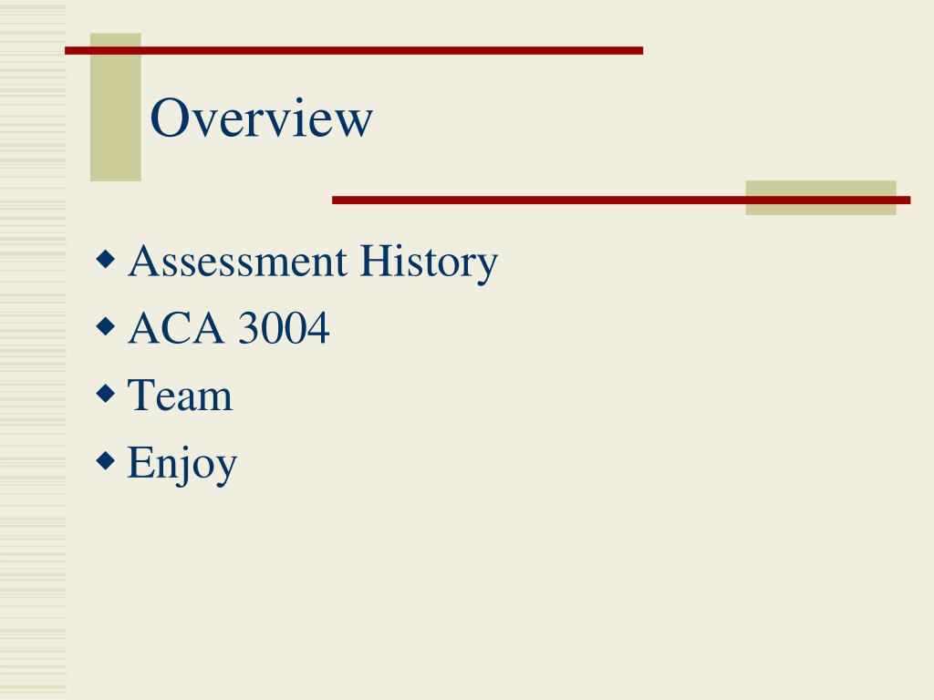 Overview • Assessment History • ACA 3004 • Team • Enjoy