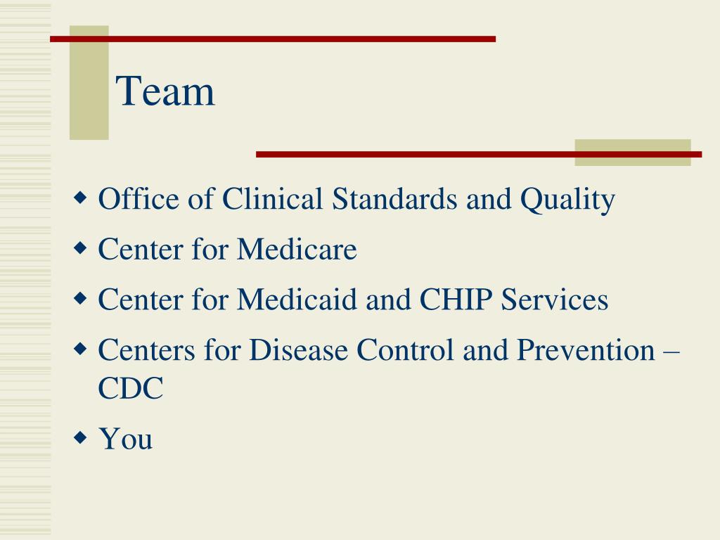 Team • Office of Clinical Standards and Quality • Center for Medicare • Center for Medicaid and CHIP Services • Centers for Disease Control and Prevention – CDC • You