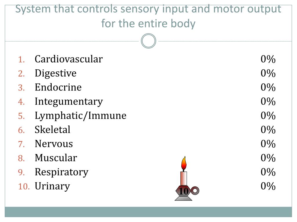 10 System that controls sensory input and motor output for the entire body • Cardiovascular • Digestive • Endocrine • Integumentary • Lymphatic/Immune • Skeletal • Nervous • Muscular • Respiratory • Urinary 0% 0% 0% 0% 0% 0% 0% 0% 0% 0%