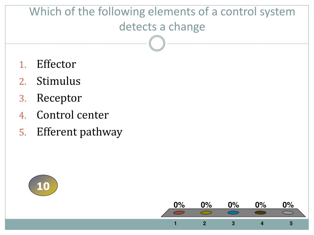 10 Which of the following elements of a control system detects a change • Effector • Stimulus • Receptor • Control center • Efferent pathway