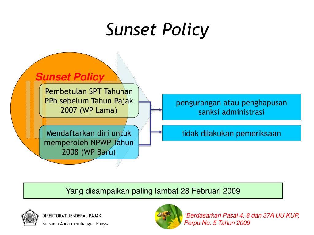 DIREKTORAT JENDERAL PAJAK Bersama Anda membangun Bangsa Sunset Policy Sunset Policy Pembetulan SPT Tahunan PPh sebelum Tahun Pajak 2007 (WP Lama) pengurangan atau penghapusan sanksi administrasi Mendaftarkan diri untuk memperoleh NPWP Tahun 2008 (WP Baru) tidak dilakukan pemeriksaan Yang disampaikan paling lambat 28 Februari 2009 *Berdasarkan Pasal 4, 8 dan 37A UU KUP, Perpu No. 5 Tahun 2009