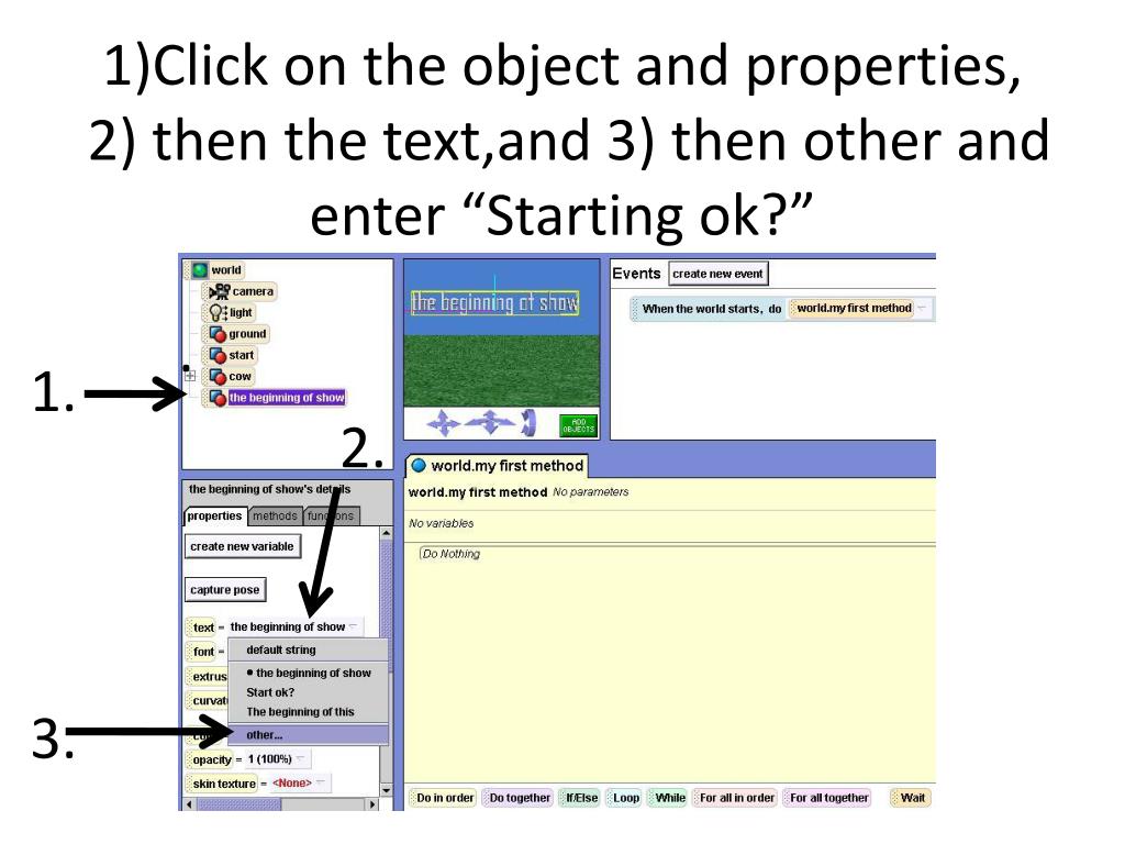 1)Click on the object and properties, 2) then the text,and 3) then other and enter “Starting ok?” . 1. 2. 3.