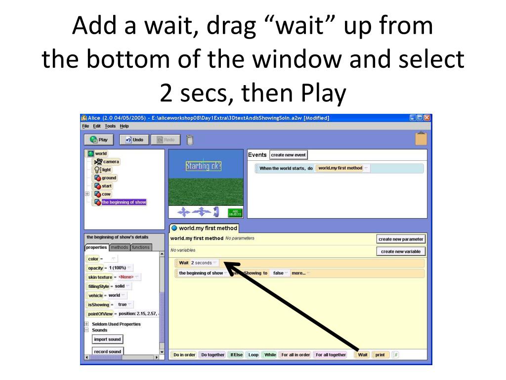 Add a wait, drag “wait” up fromthe bottom of the window and select2 secs, then Play