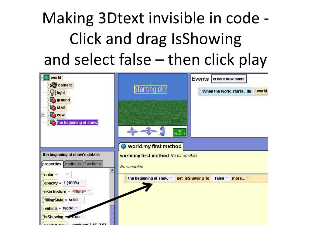 Making 3Dtext invisible in code - Click and drag IsShowingand select false – then click play