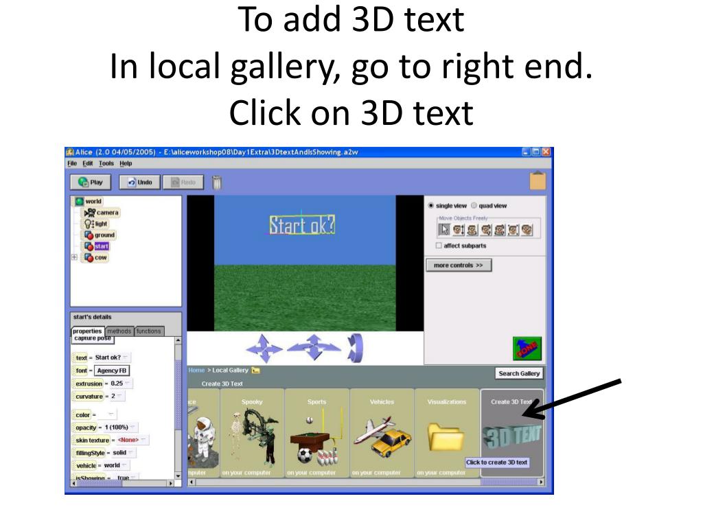 Extra notes for Day 3 June 18, 2008. Extra Notes for Day 3 – how to’s. Adding 3D text to your world How to make objects invisible during “Play” How to add a delay – “wait” How to make objects invisible at setup How to move the camera with the princess