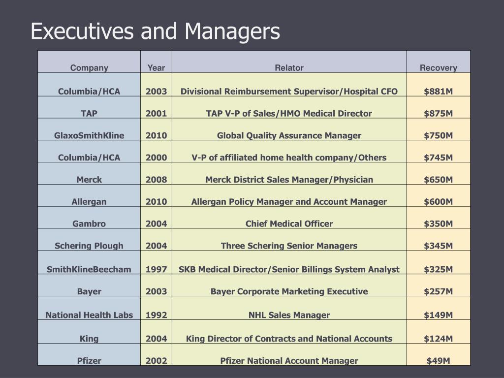 Who are the Whistleblowers? • Corporate employees (current, former) • Customers, e.g., doctors, pharmacists, HMO employees • Patients • Competitors