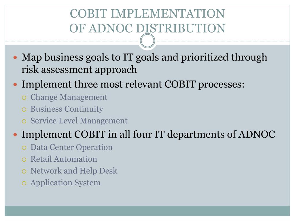 COBIT IMPLEMENTATIONOF ADNOC DISTRIBUTION • Map business goals to IT goals and prioritized through risk assessment approach • Implement three most relevant COBIT processes: • Change Management • Business Continuity • Service Level Management • Implement COBIT in all four IT departments of ADNOC • Data Center Operation • Retail Automation • Network and Help Desk • Application System