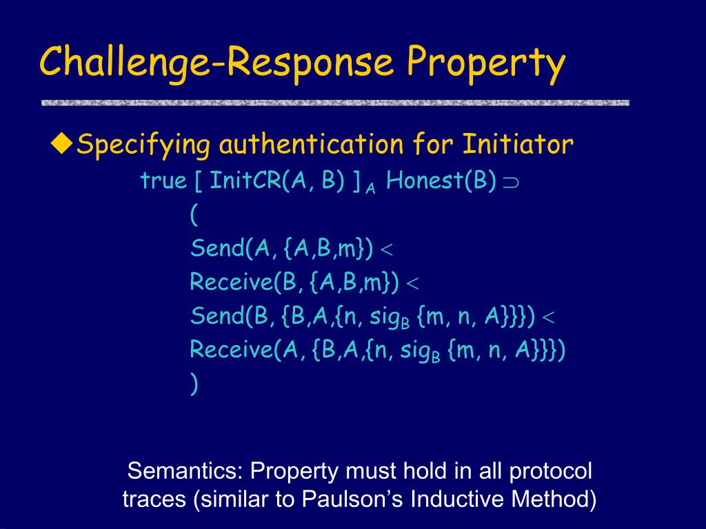 Challenge-Response Property • Specifying authentication for Initiator true [ InitCR(A, B) ] A Honest(B) ( Send(A, {A,B,m}) Receive(B, {A,B,m}) Send(B, {B,A,{n, sigB {m, n, A}}}) Receive(A, {B,A,{n, sigB {m, n, A}}}) ) Semantics: Property must hold in all protocol traces (similar to Paulson’s Inductive Method)