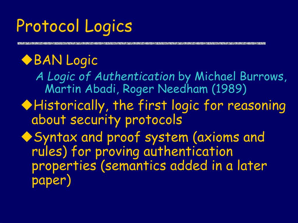 Protocol Logics • BAN Logic A Logic of Authentication by Michael Burrows, Martin Abadi, Roger Needham (1989) • Historically, the first logic for reasoning about security protocols • Syntax and proof system (axioms and rules) for proving authentication properties (semantics added in a later paper)