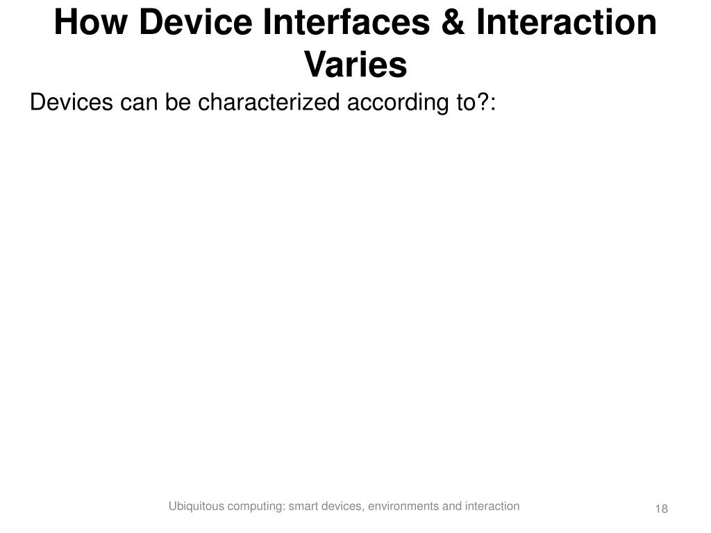 How Device Interfaces & Interaction Varies Devices can be characterized according to?: Ubiquitous computing: smart devices, environments and interaction