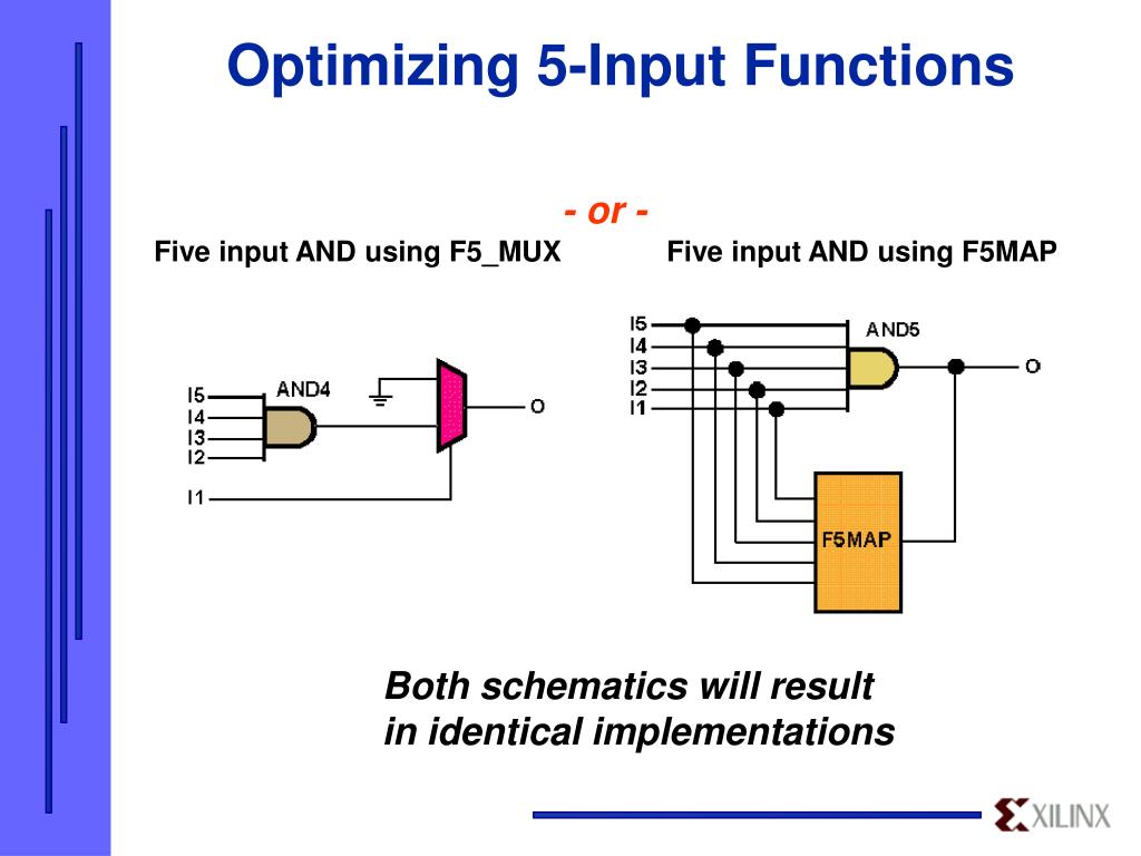 Optimizing 5-Input Functions - or - Five input AND using F5_MUX Five input AND using F5MAP Both schematics will result in identical implementations