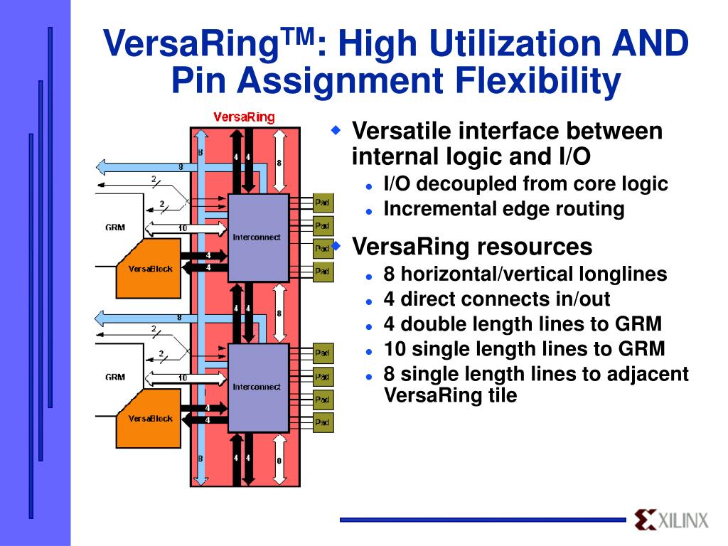 VersaRingTM: High Utilization AND Pin Assignment Flexibility • Versatile interface between internal logic and I/O • I/O decoupled from core logic • Incremental edge routing • VersaRing resources • 8 horizontal/vertical longlines • 4 direct connects in/out • 4 double length lines to GRM • 10 single length lines to GRM • 8 single length lines to adjacent VersaRing tile