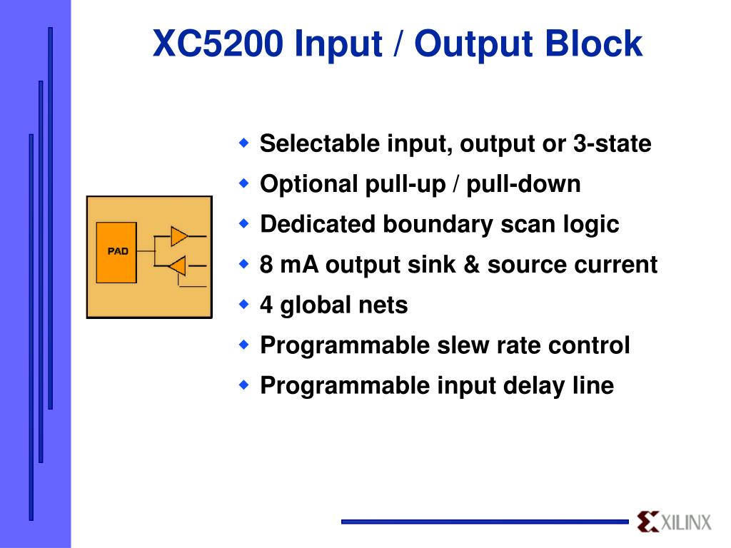 XC5200 Input / Output Block • Selectable input, output or 3-state • Optional pull-up / pull-down • Dedicated boundary scan logic • 8 mA output sink & source current • 4 global nets • Programmable slew rate control • Programmable input delay line