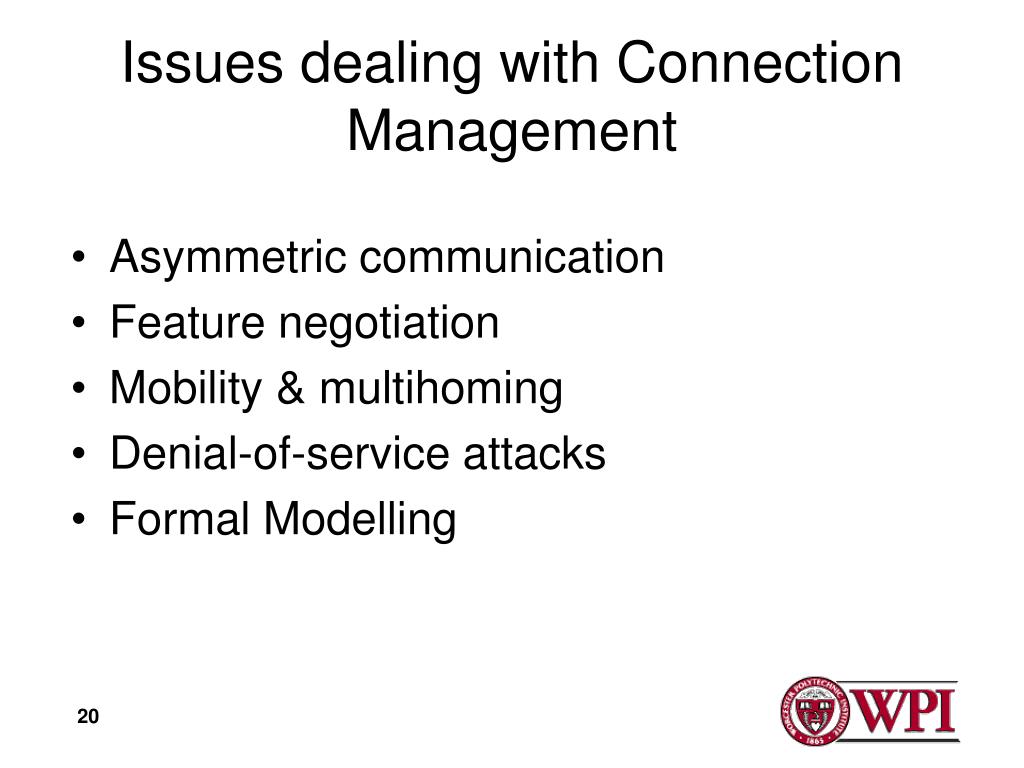 Issues dealing with Connection Management • Asymmetric communication • Feature negotiation • Mobility & multihoming • Denial-of-service attacks • Formal Modelling