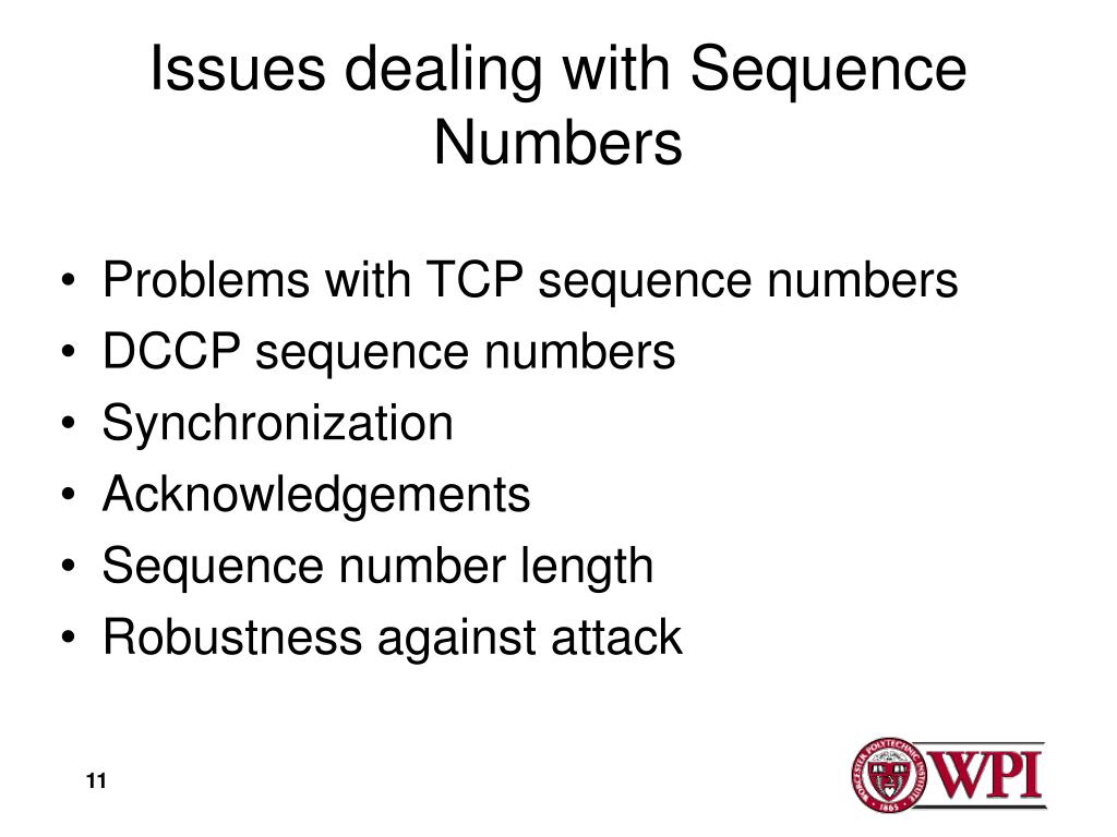 Issues dealing with Sequence Numbers • Problems with TCP sequence numbers • DCCP sequence numbers • Synchronization • Acknowledgements • Sequence number length • Robustness against attack