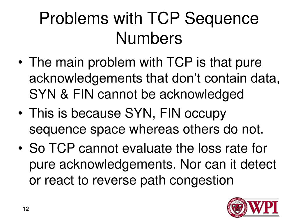 Problems with TCP Sequence Numbers • The main problem with TCP is that pure acknowledgements that don’t contain data, SYN & FIN cannot be acknowledged • This is because SYN, FIN occupy sequence space whereas others do not. • So TCP cannot evaluate the loss rate for pure acknowledgements. Nor can it detect or react to reverse path congestion