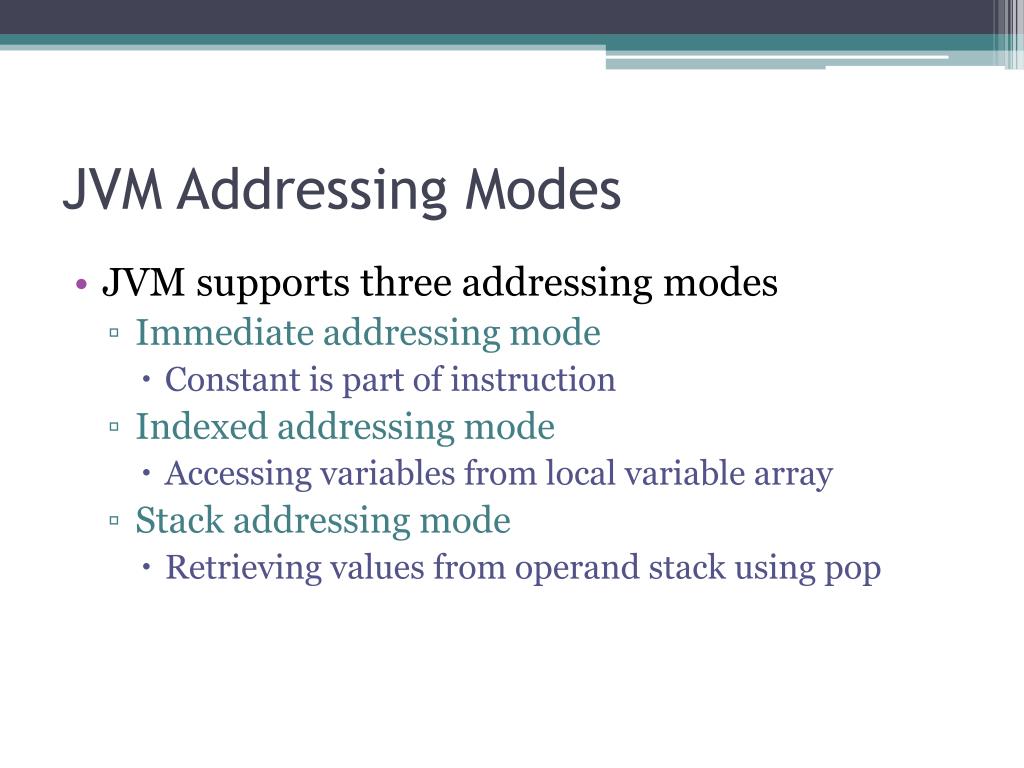 JVM Addressing Modes • JVM supports three addressing modes • Immediate addressing mode • Constant is part of instruction • Indexed addressing mode • Accessing variables from local variable array • Stack addressing mode • Retrieving values from operand stack using pop