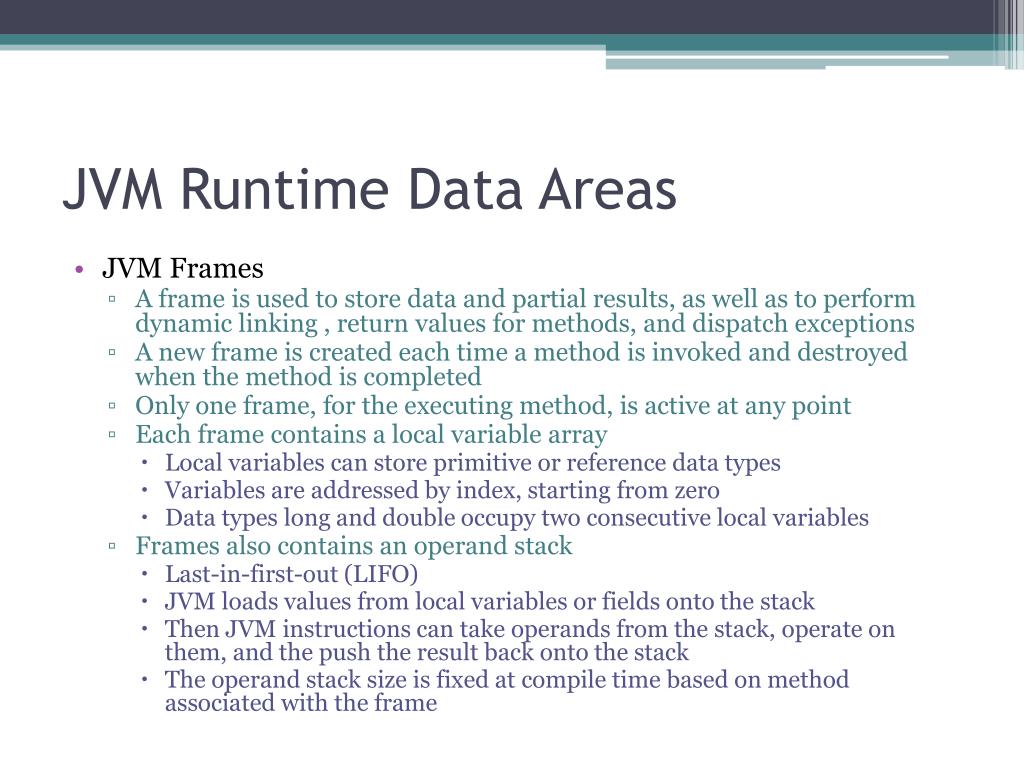 JVM Runtime Data Areas • Since JVM is a virtual machine it doesn’t have any physical registers , instead it defines various runtime data areas that are used during execution of a program • One of the areas defined is the program counter register • Each thread of control has its own PC register • The register is wide enough to contain a returnAddress or a native pointer on the specific platform