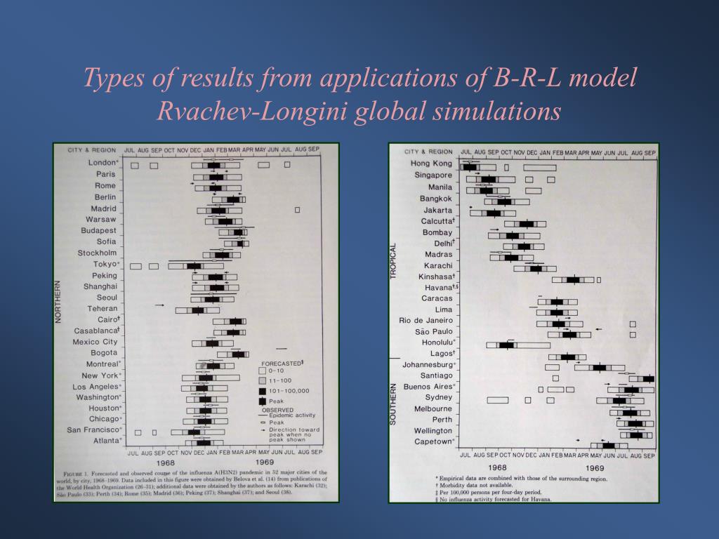 Types of results from applications of B-R-L model Rvachev-Longini global simulations