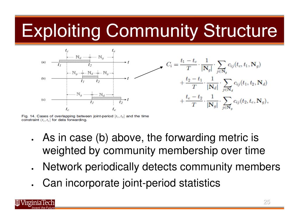 Exploiting Community Structure As in case (b) above, the forwarding metric is weighted by community membership over time Network periodically detects community members Can incorporate joint-period statistics 25