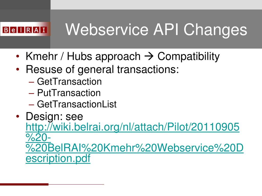 Webservice API Changes • Kmehr / Hubs approach Compatibility • Resuse of general transactions: • GetTransaction • PutTransaction • GetTransactionList • Design: see http://wiki.belrai.org/nl/attach/Pilot/20110905%20-%20BelRAI%20Kmehr%20Webservice%20Description.pdf