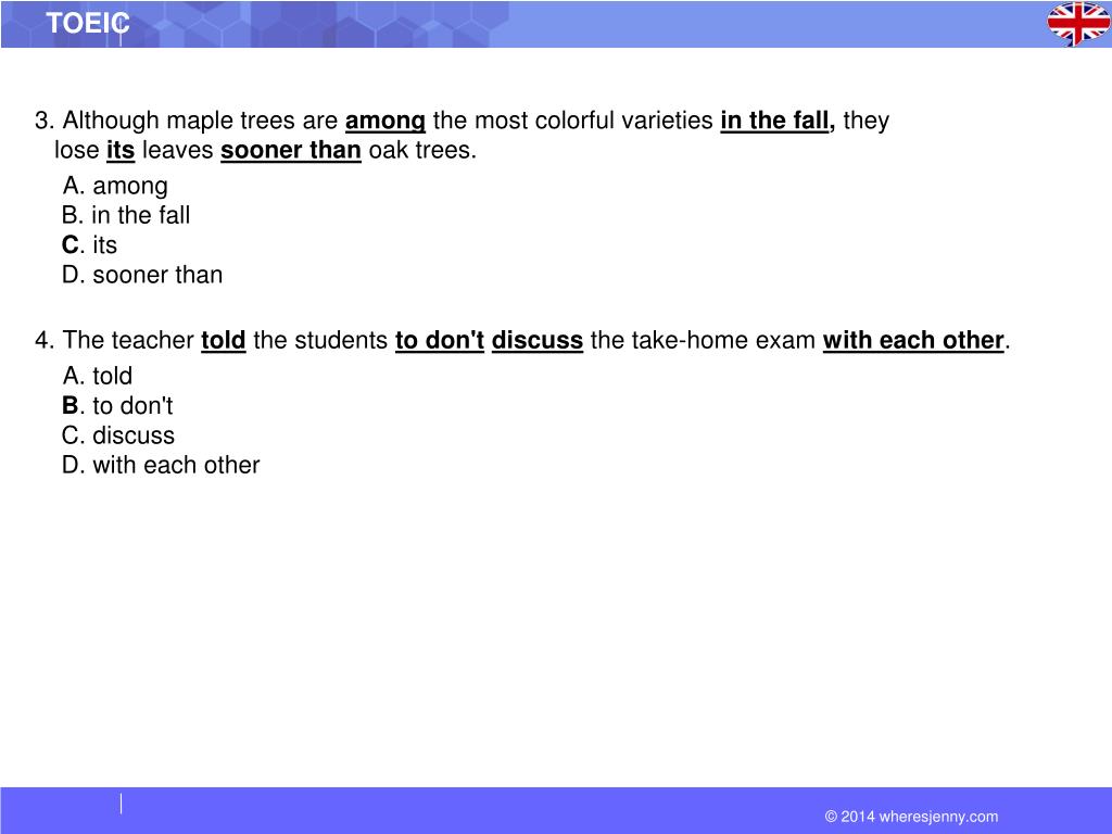 3. Although maple trees are amongthe most colorful varietiesin the fall, they loseitsleavessooner thanoak trees. A. among B. in the fall C. its D. sooner than 4. The teacher toldthe studentsto don'tdiscussthe take-home examwith each other. A. told B. to don't C. discuss D. with each other