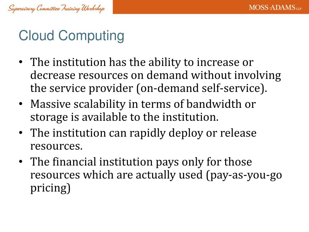 Cloud Computing • The institution has the ability to increase or decrease resources on demand without involving the service provider (on-demand self-service). • Massive scalability in terms of bandwidth or storage is available to the institution. • The institution can rapidly deploy or release resources. • The financial institution pays only for those resources which are actually used (pay-as-you-go pricing)