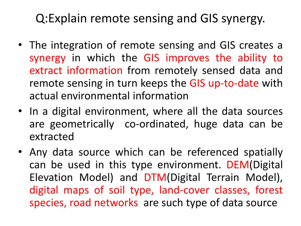 Q:Explain remote sensing and GIS synergy. • The integration of remote sensing and GIS creates a synergy in which the GIS improves the ability to extract information from remotely sensed data and remote sensing in turn keeps the GIS up-to-date with actual environmental information • In a digital environment, where all the data sources are geometrically co-ordinated, huge data can be extracted • Any data source which can be referenced spatially can be used in this type environment. DEM(Digital Elevation Model) and DTM(Digital Terrain Model), digital maps of soil type, land-cover classes, forest species, road networks are such type of data source