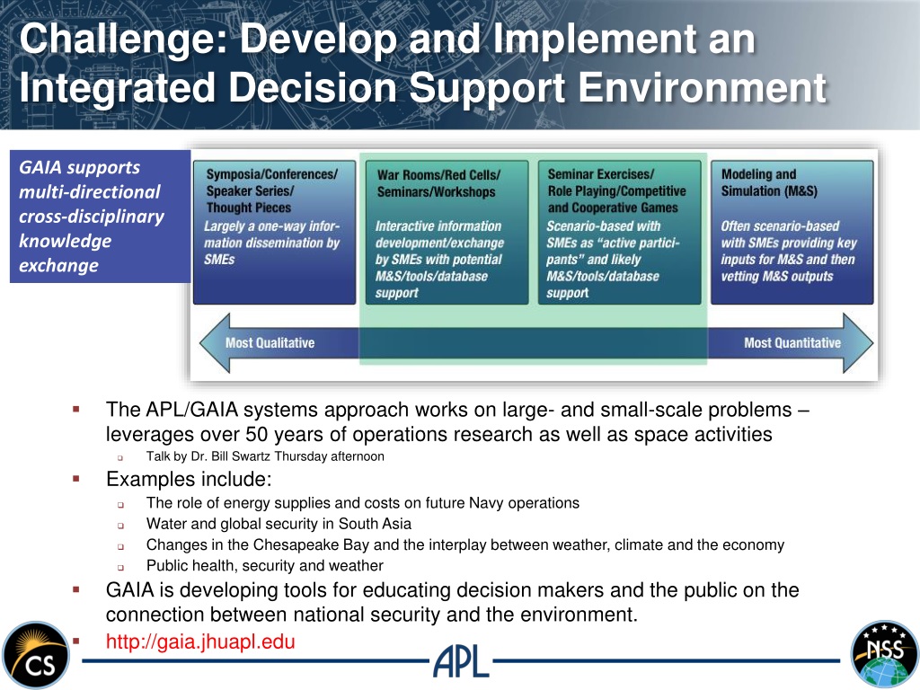 Challenge: Develop and Implement an Integrated Decision Support Environment • The APL/GAIA systems approach works on large- and small-scale problems – leverages over 50 years of operations research as well as space activities • Talk by Dr. Bill Swartz Thursday afternoon • Examples include: • The role of energy supplies and costs on future Navy operations • Water and global security in South Asia • Changes in the Chesapeake Bay and the interplay between weather, climate and the economy • Public health, security and weather • GAIA is developing tools for educating decision makers and the public on the connection between national security and the environment. • http://gaia.jhuapl.edu GAIA supports multi-directional cross-disciplinary knowledge exchange