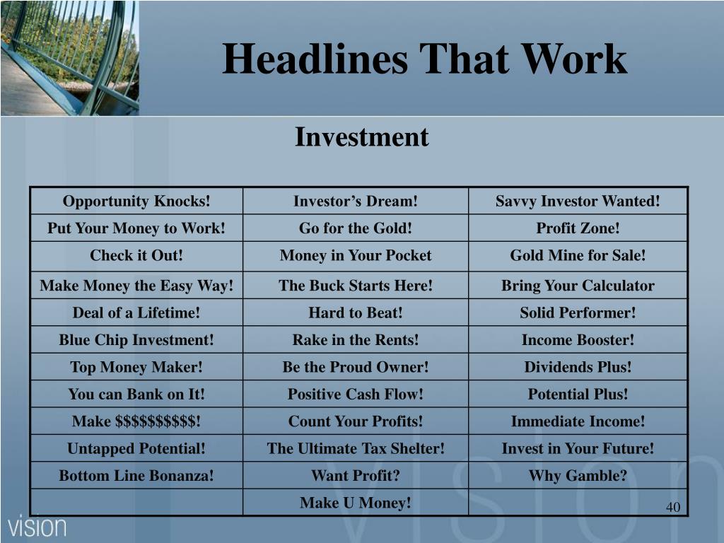 Writing Effective Real Estate Ads • Tips • Headlines that work • Effective closing lines • Buzz words to avoid • Amenities and descriptions