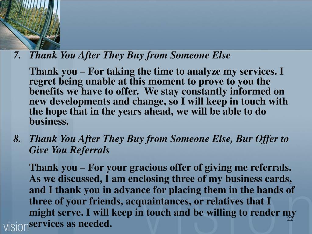 Thank You After They Buy from Someone Else • Thank you – For taking the time to analyze my services. I regret being unable at this moment to prove to you the benefits we have to offer. We stay constantly informed on new developments and change, so I will keep in touch with the hope that in the years ahead, we will be able to do business. • Thank You After They Buy from Someone Else, Bur Offer to Give You Referrals • Thank you – For your gracious offer of giving me referrals. As we discussed, I am enclosing three of my business cards, and I thank you in advance for placing them in the hands of three of your friends, acquaintances, or relatives that I might serve. I will keep in touch and be willing to render my services as needed.