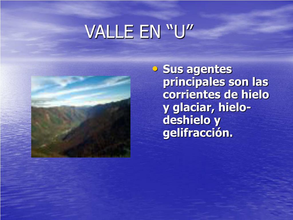VALLE EN “U” • Sus agentes principales son las corrientes de hielo y glaciar, hielo-deshielo y gelifracción.