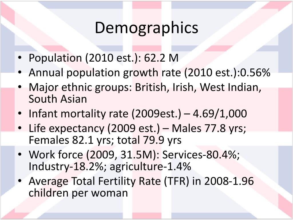 Demographics • Population (2010 est.): 62.2 M • Annual population growth rate (2010 est.):0.56% • Major ethnic groups: British, Irish, West Indian, South Asian • Infant mortality rate (2009est.) – 4.69/1,000 • Life expectancy (2009 est.) – Males 77.8 yrs; Females 82.1 yrs; total 79.9 yrs • Work force (2009, 31.5M): Services-80.4%; Industry-18.2%; agriculture-1.4% • Average Total Fertility Rate (TFR) in 2008-1.96 children per woman