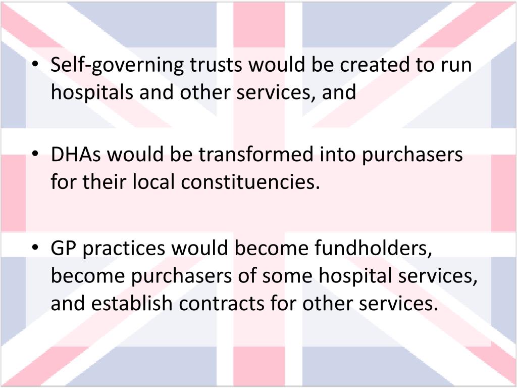 Self-governing trusts would be created to run hospitals and other services, and • DHAs would be transformed into purchasers for their local constituencies. • GP practices would become fundholders, become purchasers of some hospital services, and establish contracts for other services.