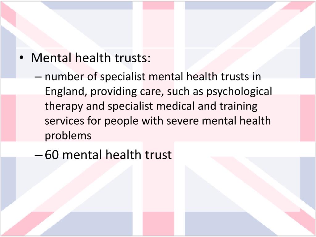 Mental health trusts: • number of specialist mental health trusts in England, providing care, such as psychological therapy and specialist medical and training services for people with severe mental health problems • 60 mental health trust