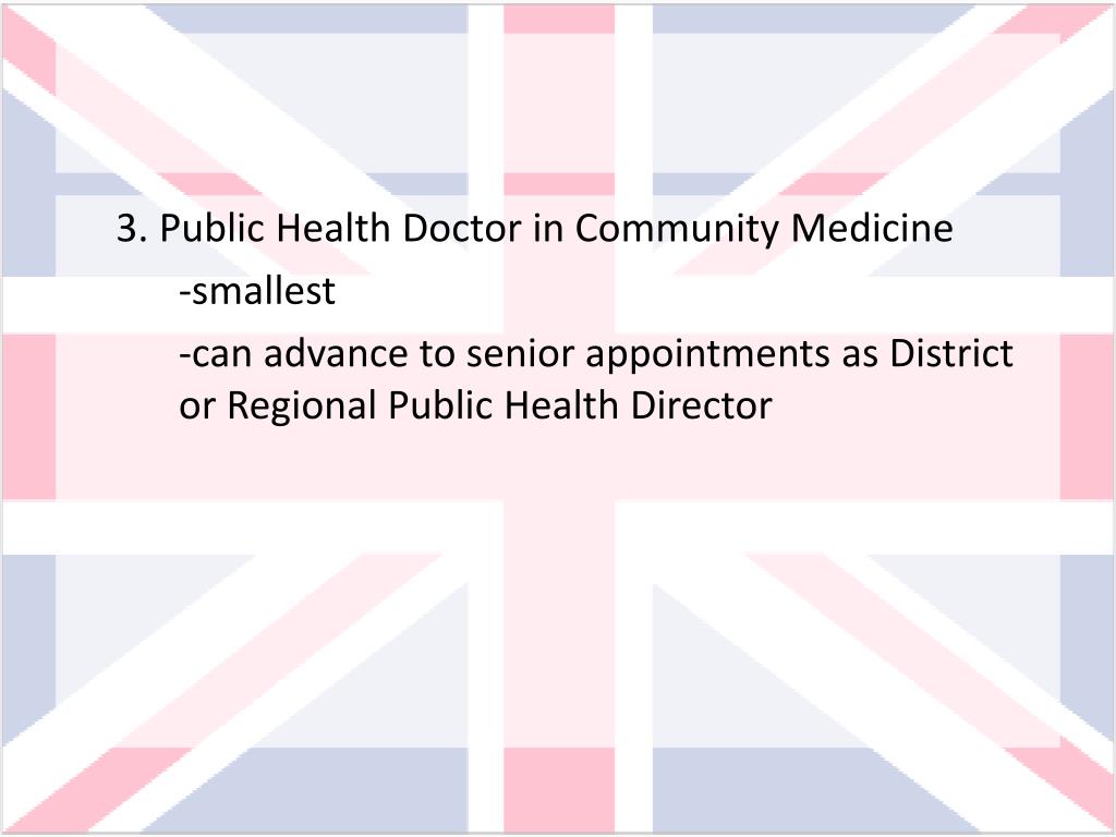 3. Public Health Doctor in Community Medicine -smallest -can advance to senior appointments as District or Regional Public Health Director