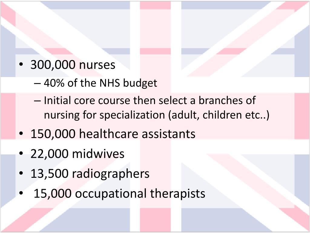 300,000 nurses • 40% of the NHS budget • Initial core course then select a branches of nursing for specialization (adult, children etc..) • 150,000 healthcare assistants • 22,000 midwives • 13,500 radiographers • 15,000 occupational therapists