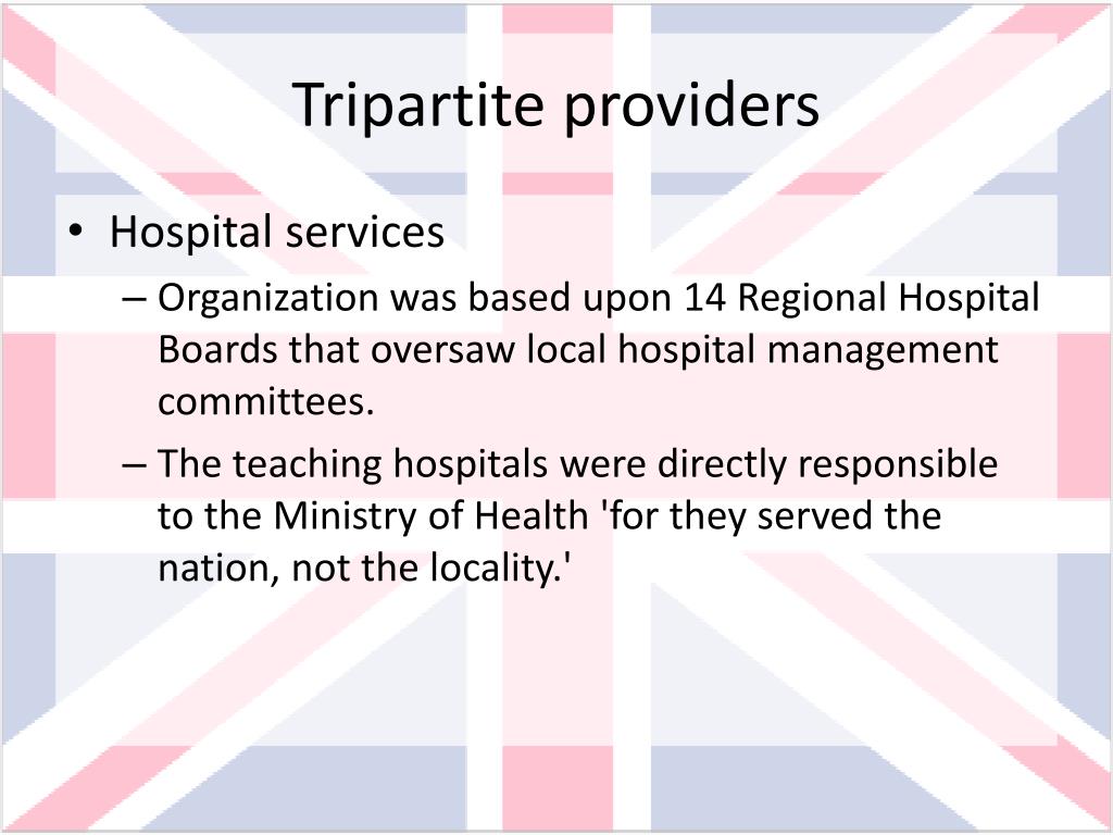 Tripartite providers • Hospital services • Organization was based upon 14 Regional Hospital Boards that oversaw local hospital management committees. • The teaching hospitals were directly responsible to the Ministry of Health 'for they served the nation, not the locality.'
