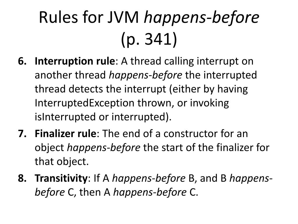 Rules for JVM happens-before(p. 341) • Interruption rule: A thread calling interrupt on another thread happens-before the interrupted thread detects the interrupt (either by having InterruptedException thrown, or invoking isInterrupted or interrupted). • Finalizer rule: The end of a constructor for an object happens-before the start of the finalizer for that object. • Transitivity: If A happens-before B, and B happens-before C, then A happens-before C.