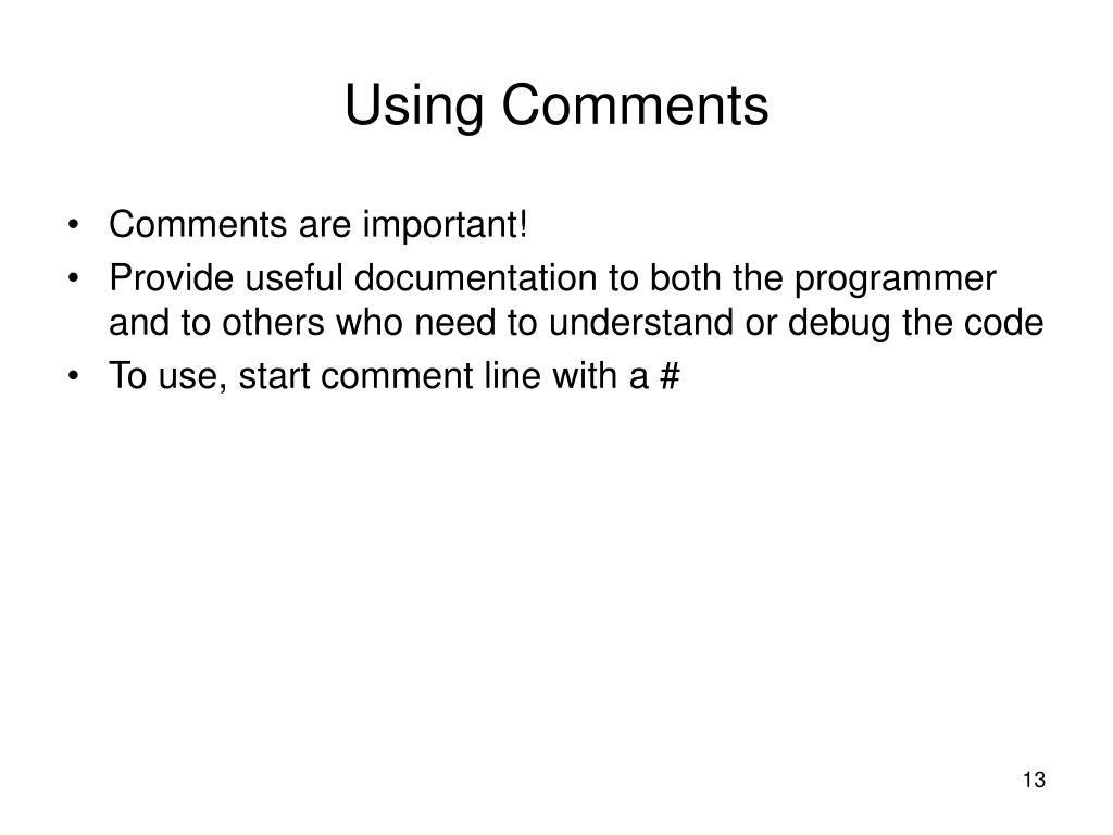 Using Comments • Comments are important! • Provide useful documentation to both the programmer and to others who need to understand or debug the code • To use, start comment line with a #