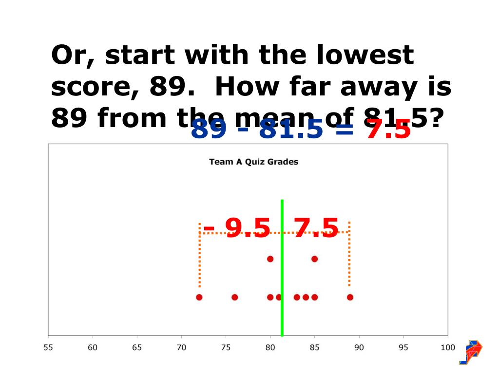 Or, start with the lowest score, 89. How far away is 89 from the mean of 81.5? 89 - 81.5 = 7.5 - 9.5 7.5