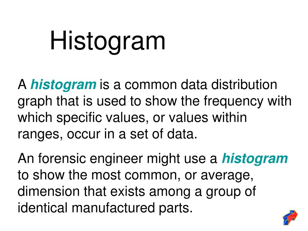 Histogram A histogram is a common data distribution graph that is used to show the frequency with which specific values, or values within ranges, occur in a set of data. An forensic engineer might use a histogram to show the most common, or average, dimension that exists among a group of identical manufactured parts.