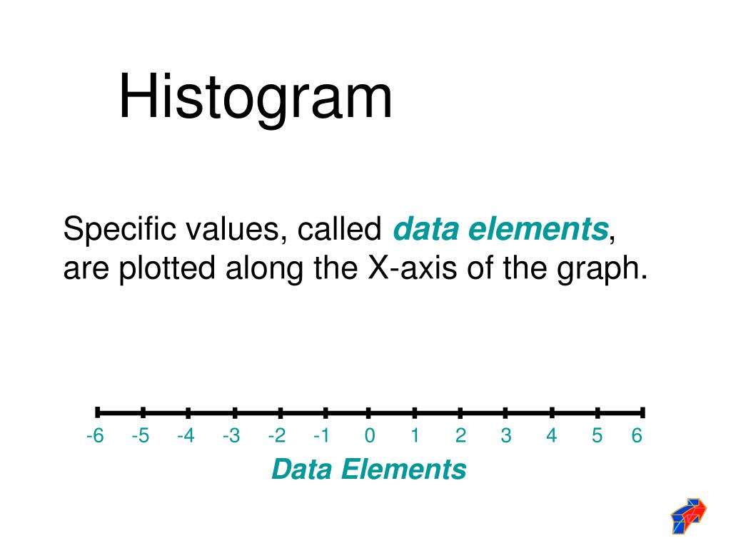 Histogram Specific values, called data elements, are plotted along the X-axis of the graph. -6 -5 -4 -3 -2 -1 0 1 2 3 4 5 6 Data Elements