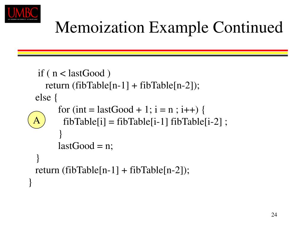 Memoization Example Continued if ( n < lastGood ) return (fibTable[n-1] + fibTable[n-2]); else { for (int = lastGood + 1; i = n ; i++) { fibTable[i] = fibTable[i-1] fibTable[i-2] ; } lastGood = n; } return (fibTable[n-1] + fibTable[n-2]); } A