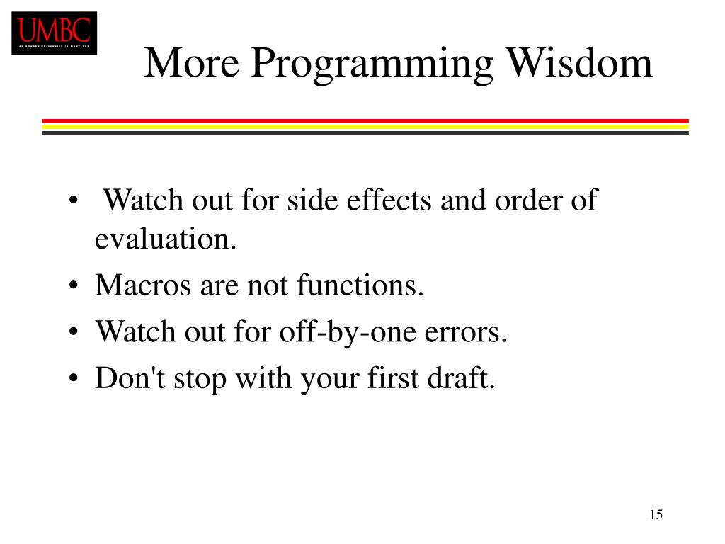 More Programming Wisdom • Watch out for side effects and order of evaluation. • Macros are not functions. • Watch out for off-by-one errors. • Don't stop with your first draft.